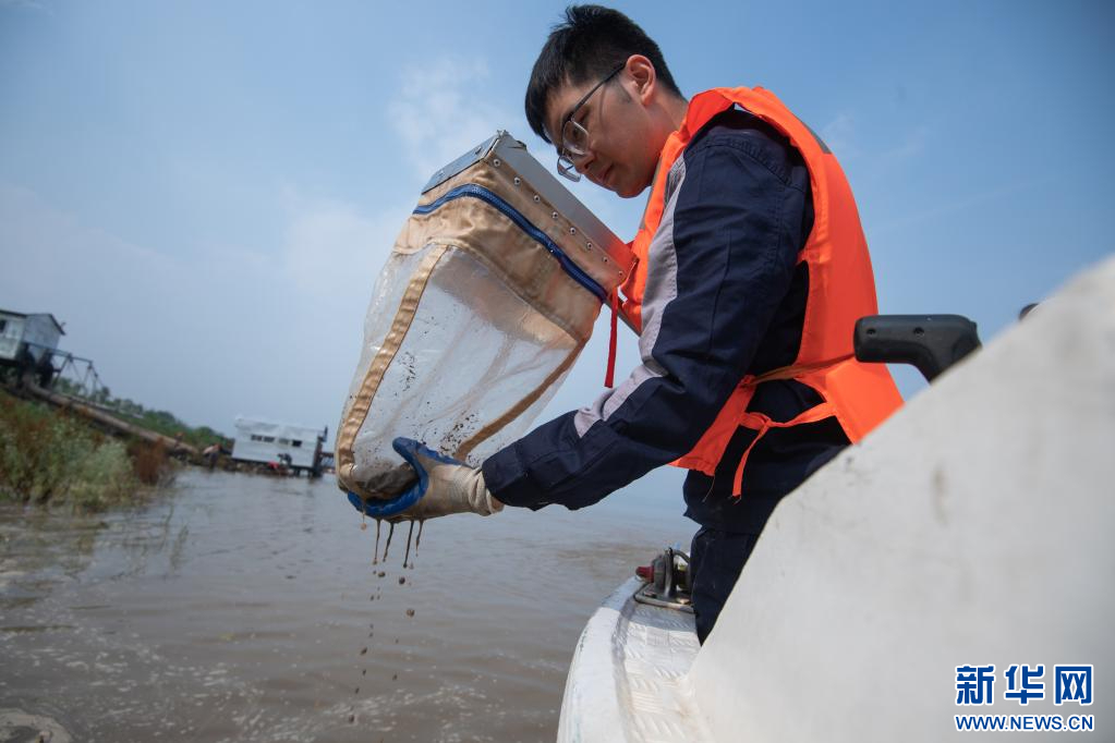 5月11日,监测人员熊少凯在武汉汉南区江段进行底栖动物样品采集。