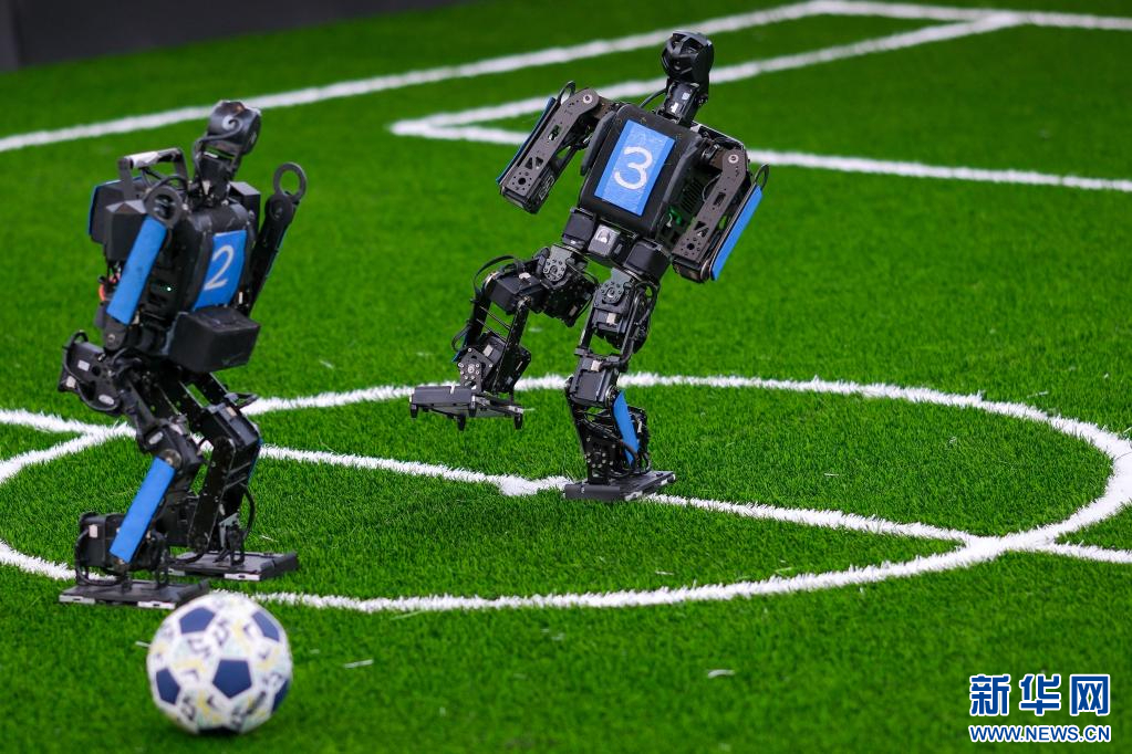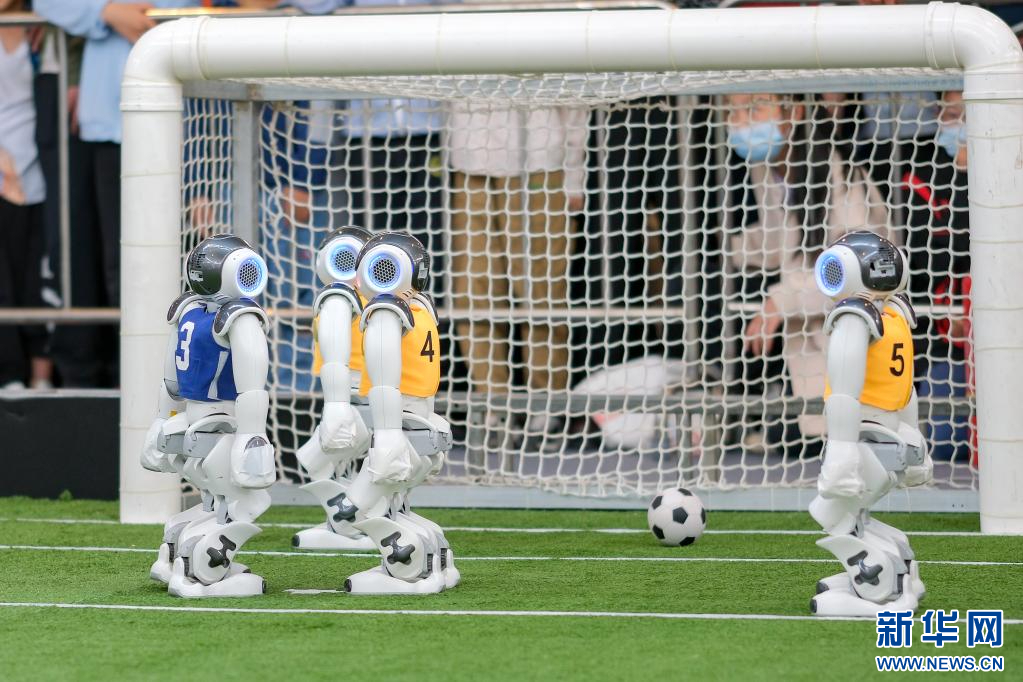 这是5月20日拍摄的机器人足球类人组比赛现场。
