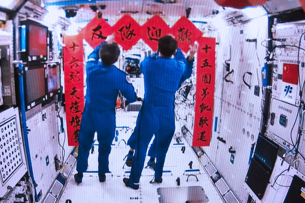 5月30日在北京航天飞行控制中心拍摄的神舟十五号航天员乘组在天和核心舱张贴对联欢迎神舟十六号航天员乘组的画面。