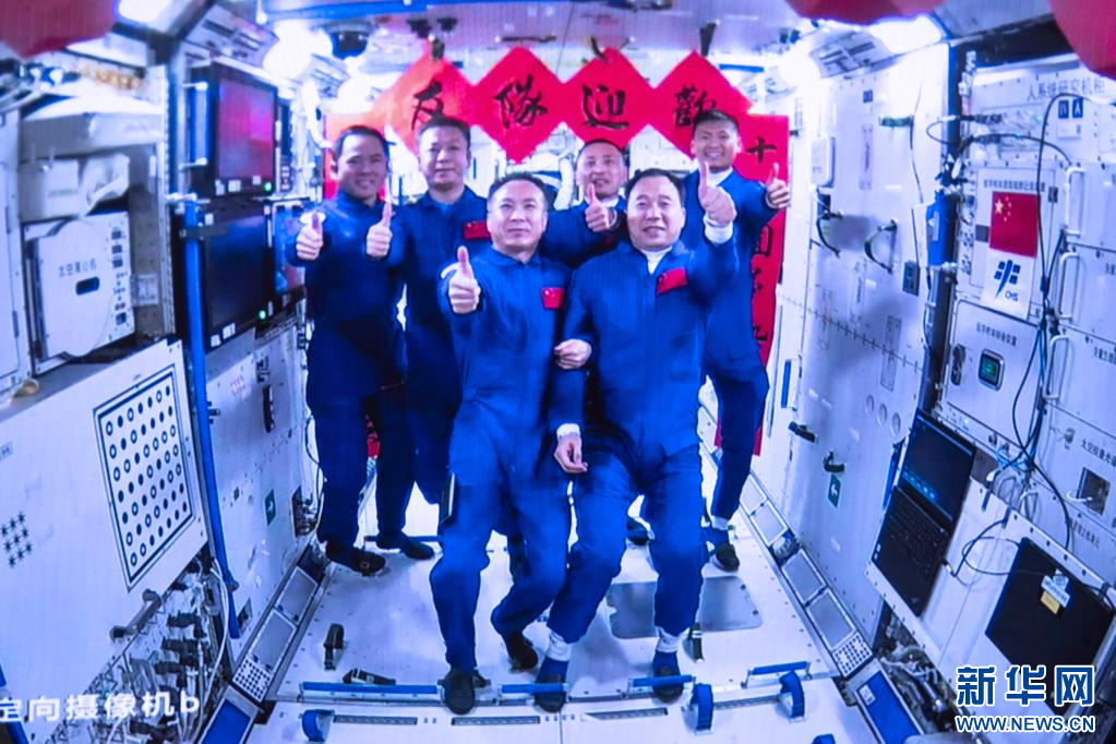 据中国载人航天工程办公室消息,在载人飞船与空间站组合体成功实现自主快速交会对接后,神舟十六号航天员乘组从飞船返回舱进入轨道舱。5月30日18时22分,翘盼已久的神舟十五号航天员乘组顺利打开“家门”,欢迎远道而来的神舟十六号航天员乘组入驻“天宫”。随后,两个航天员乘组拍下“全家福”,共同向牵挂他们的全国人民报平安。