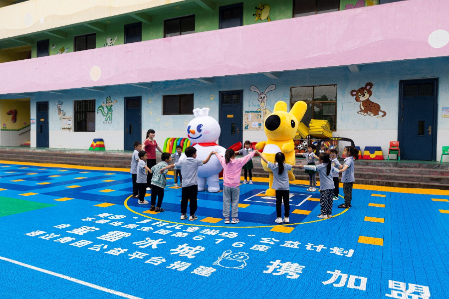 在河南省开封市兰考县东坝头镇中心幼儿园的新操场上,孩子们与雪王、袋鼠一起唱歌谣