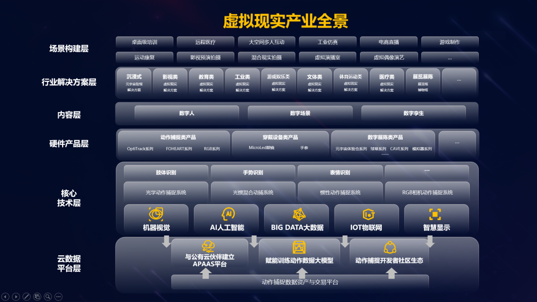 “过去数据采集动捕过程复杂,环节搭建成本高,动捕数据一事一用效率低,常被外界称为“小行业”。面对行业痛点,我们在AI时代找到了解决方案。”刘耀东表示。基于位置关系的动作捕捉技术是影视制作、工业仿真、虚拟数字人、机器人训练等众多行业领域的关键共性技术,在过去的应用中已经积累了海量的动捕数据,这些都是最宝贵的数据资产。未来,虚拟动点将与云厂商合作,通过建立动捕数据资产和云能力平台,对动捕数据进行平台化管理;实现数据应用产品化、标准化、资产化,鼓励相关从业者利用云平台上的能力进行动捕相关业务开发;同时,建立开发者社区,促进动作捕捉相关产业生态蓬勃发展。