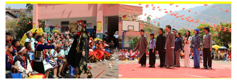 这次文艺演出四川师大大学生艺术团专门为孩子们编排的课本剧《为中华之崛起而读书》《王二小》,激励孩子们从小立下大志向,也呈现了丰富多彩的传统文化川剧变脸、吐火、木偶戏等新颖的节目形式,使得第一次近距离接触国粹的孩子们兴奋地拍手欢呼。都尔小学校长吉古成武表示,学校里80%以上的孩子都是留守儿童或者单亲(孤儿)儿童,平时很难现场观看京剧等传统国粹艺术,孩子们看京剧的过程,也是听故事、学历史的过程。成都京剧研究院的专业演员与学生们互动中亲自教他们学习京剧舞蹈动作,让他们近距离感受我们传统文化之美。