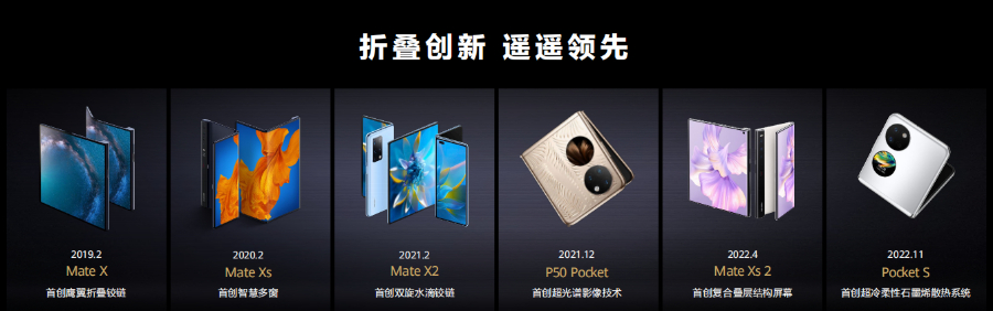回顾华为折叠屏历史,2019年,华为发布首款折叠屏手机华为Mate X,开启对未来智能手机形态的无限遐想,此后华为在折叠屏形态上不断突破创新;在2020 年,华为发布了第二代折叠屏华为Mate Xs,实现了折叠屏手机生态系统的演进;2021年,华为发布华为Mate X2,实现行业内的无缝内折折叠体验;2021年12月,华为发布了精致灵巧的上下折叠设计的华为P50 Pocket,2023年3月发布全新突破的内折折叠屏Mate X3。华为已成为市面上手握三种折叠形态的手机厂商。