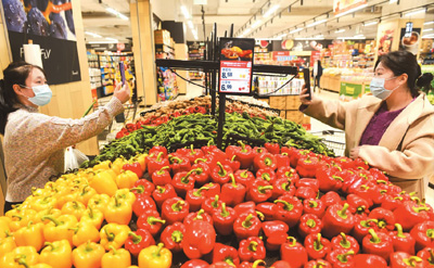 在安徽省阜阳市颍东区永辉超市世纪金源店蔬菜专区,市民通过手机扫码了解购买蔬菜的详细信息。