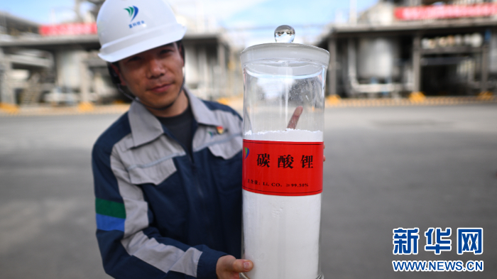 青海盐湖蓝科锂业股份有限公司一名工作人员在展示生产的碳酸锂成品(6月9日摄)。