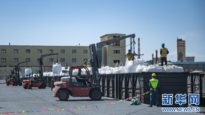 6月12日,在青海盐湖工业股份有限公司钾肥分公司货场,工作人员在装运钾肥。