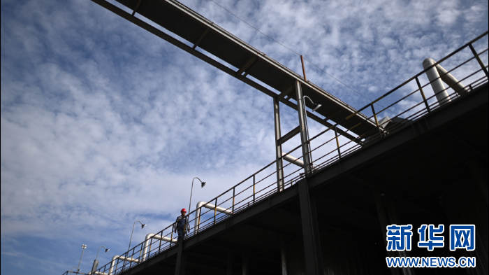 一名工作人员在青海盐湖蓝科锂业股份有限公司生产区内巡检(6月9日摄)。