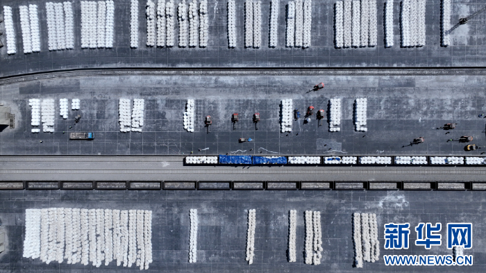 6月12日,在青海盐湖工业股份有限公司钾肥分公司货场,工作人员在装运钾肥(无人机照片)。