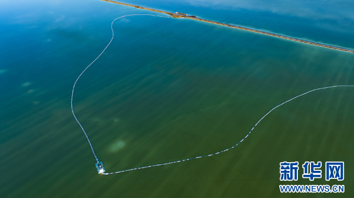 这是6月8日在察尔汗盐湖拍摄的一艘采盐船(无人机照片)。