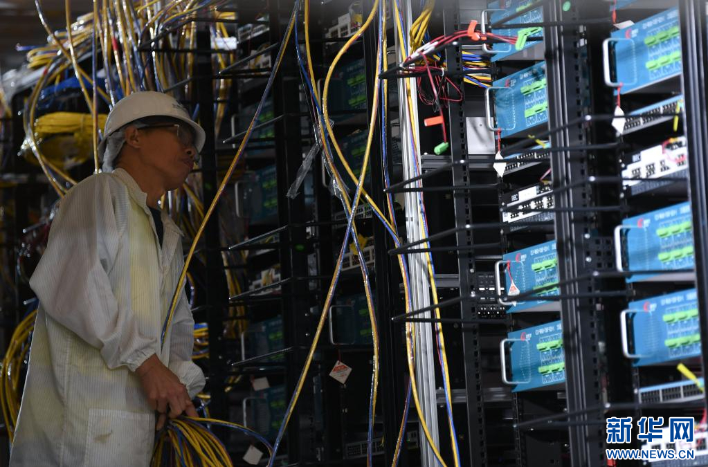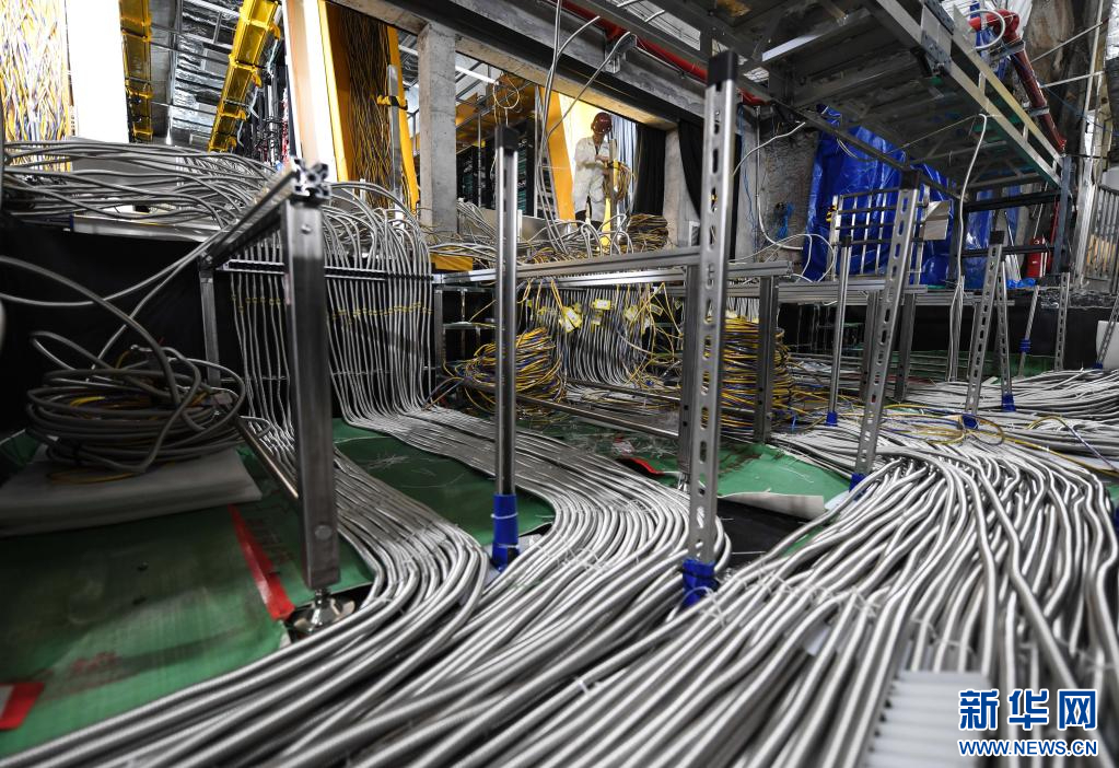 6月15日,工作人员在江门中微子实验地下大厅内布线。