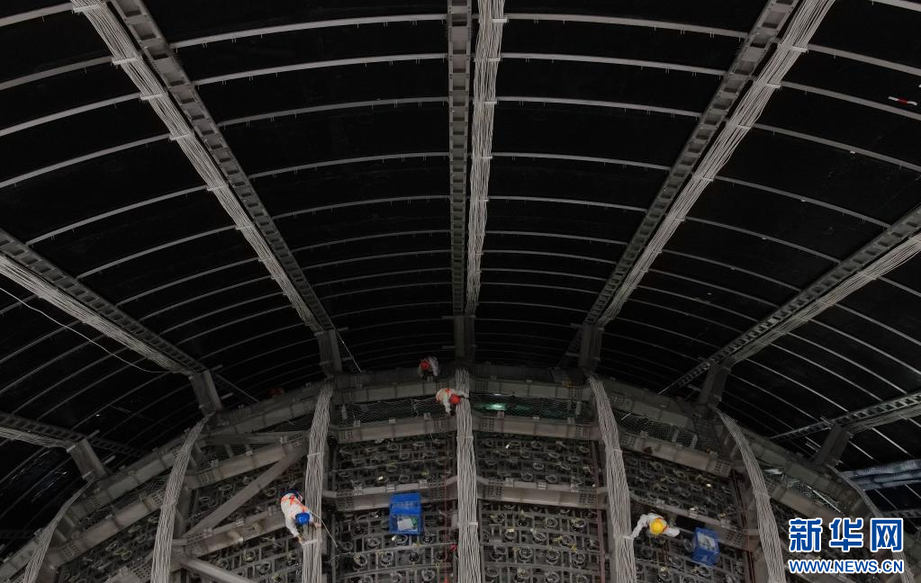 江门中微子实验位于广东省江门开平市,是由中科院和广东省共同建设的大科学装置,以测定中微子质量顺序、精确测量中微子混合参数为主要科学目标,并进行其他多项科学前沿研究。 地下探测器目前已完成不锈钢网架安装,预计2024年建成运行,届时将成为国际中微子研究的中心之一。 新华社记者 邓华 摄pagebreak