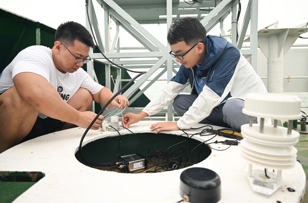 测试开始前,工作人员在“电科1号”综合试验船上安装高清光电设备(6月14日摄)。