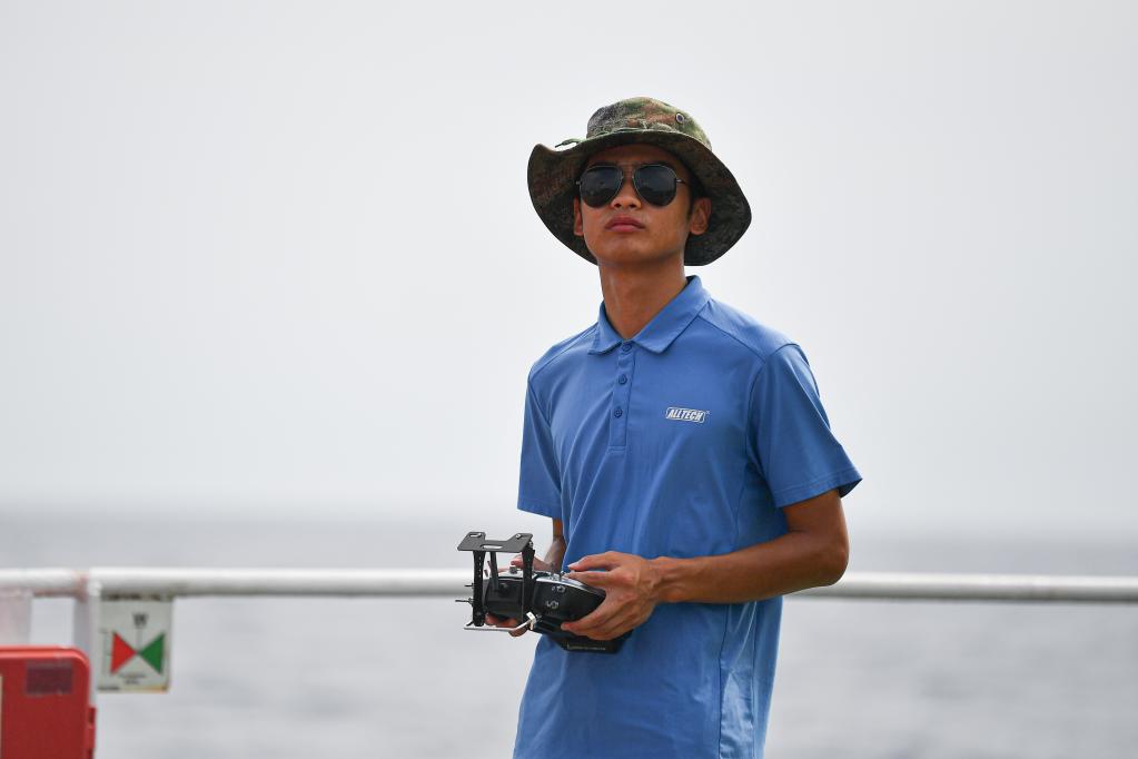 工作人员在“电科1号”综合试验船上操控无人机,配合此次远海测试(6月15日摄)。