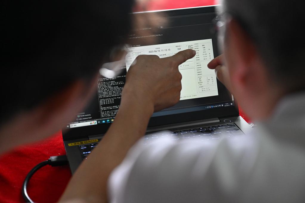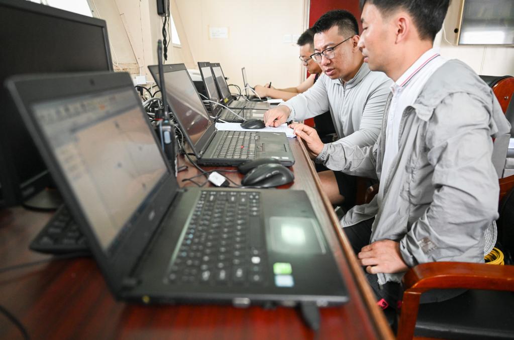 工作人员在“电科1号”综合试验船上验证高低轨卫星、无人机协同通信覆盖能力(6月15日摄)。