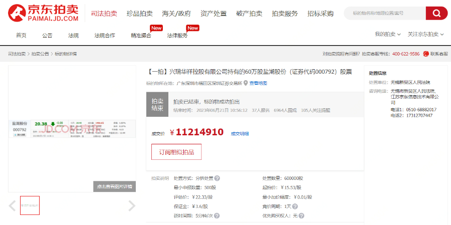 “18.7元,成交!”经过359次竞价,整个拍卖延迟近1小时,无锡市新吴区人民法院(以下简称“新吴法院”)联合京东拍卖,通过京东拍卖提供的分拆拍卖流程,实现全国首例大宗股权分拆处置,将60万股总价近1200万元的盐湖股份,分拆为500股为一个单位进行单独拍卖,最终以11214910元的总价成交,每股价格18.7元,相比同时段二级市场价格为18.9元,仅有1%的折价,在大宗股票司法拍卖中打造大宗股票“拆分处置”新法的新路径。相对于常见的整体打包的处置方式,更灵活的分拆处置方式,带动了处置资产围观量、参拍人数及成交金额等多维度的提升,也一定程度上彰显了司法执行的便捷度与智慧化,切实保障当事人的权益最大化。