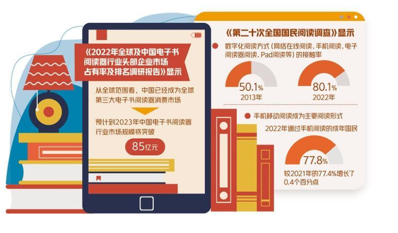 《第二十次全国国民阅读调查》显示,数字化阅读方式(网络在线阅读、手机阅读、电子阅读器阅读、Pad阅读等)的接触率由2013年的50.1%升至2022年的80.1%。数字化阅读已成为大众日常阅读的重要组成部分。