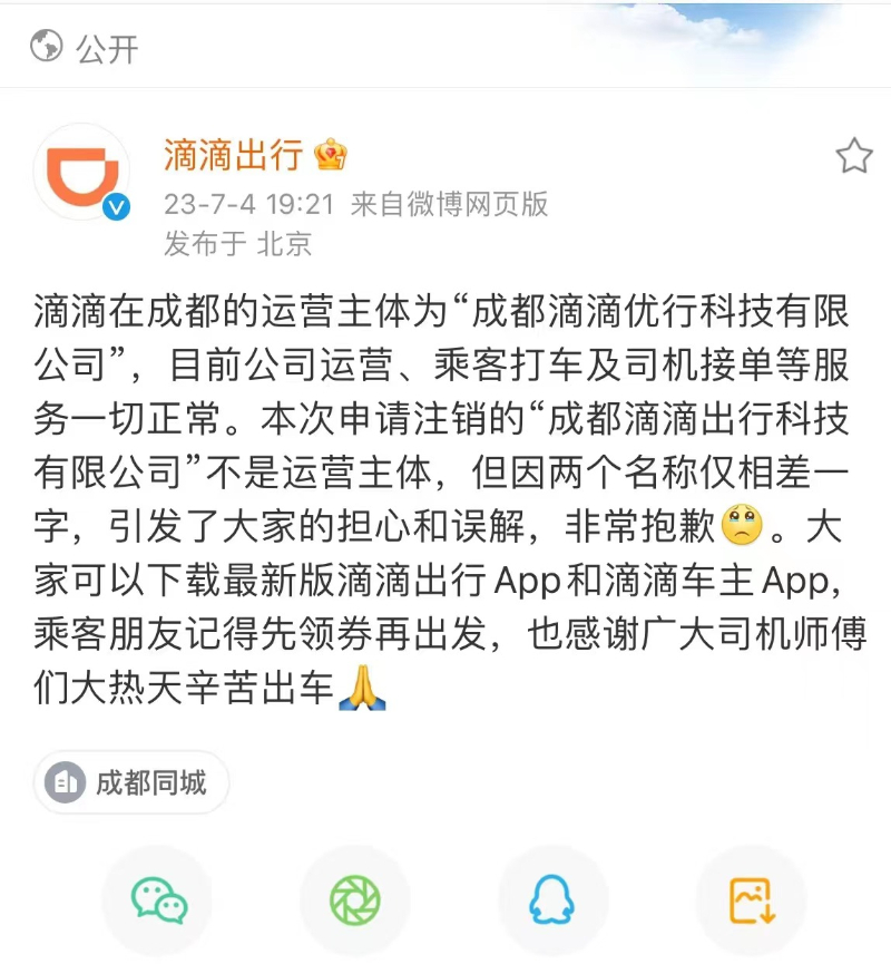 滴滴方面表示,本次申请注销的“成都滴滴出行科技有限公司”不是运营主体,但因两个名称仅相差一字,引发了大家的担心和误解,非常抱歉。大家可以下载最新版滴滴出行App和滴滴车主App,乘客朋友记得先领券再出发,也感谢广大司机师傅们大热天辛苦出车。