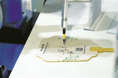 SoundAI声智机械手臂在二〇二三世界人工智能大会展会现场进行团扇书法写作。 新华社发(李心怡摄)