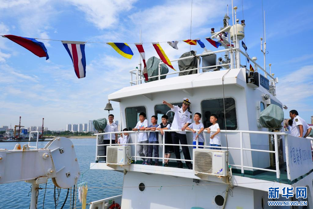 7月11日,在位于山东烟台的交通运输部北海航海保障中心烟台航标处的“海巡15017”轮上,船员为小朋友们讲解航海知识。