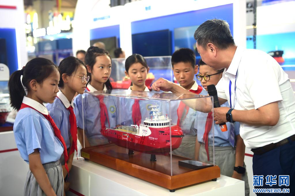 7月11日,沧州市实验小学学生在2023年航海科技博览会上了解中海油田服务股份有限公司的新型船舶。