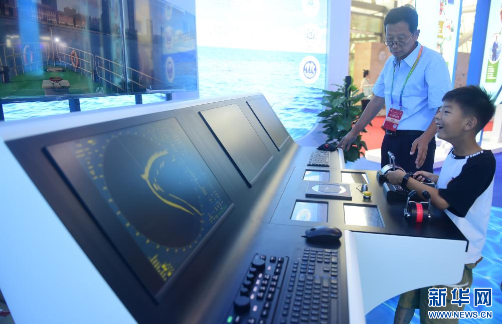 7月11日,小朋友在河北沧州举行的2023年航海科技博览会上模拟操作轮船。