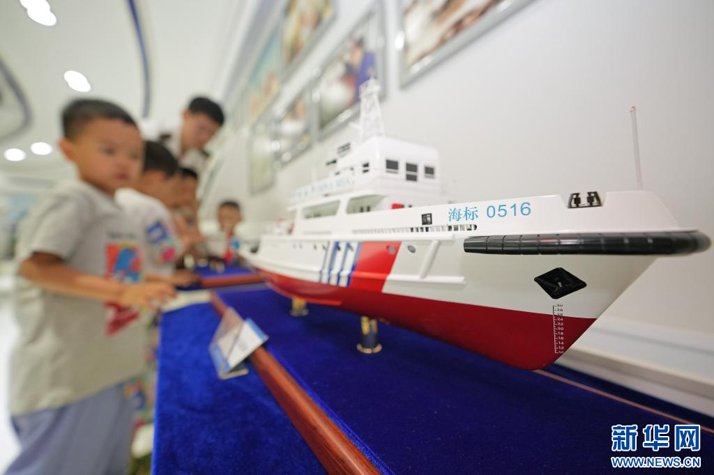 7月11日,在位于山东烟台的交通运输部北海航海保障中心烟台航标处的航标历史文化展室,小朋友们观看航标船模型。
