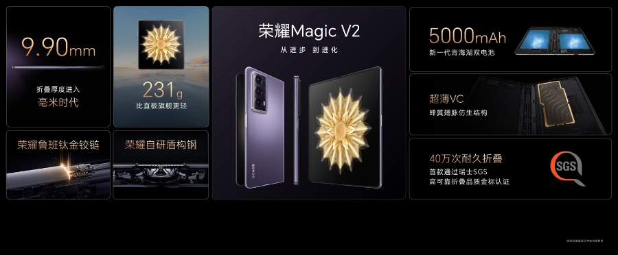 跳脱出传统折叠屏手机的框架,荣耀从消费者的需求出发思考产品设计,从设计理念、材料、器件、模组、散热、结构等所有方面重新考量,跨行业进行借鉴,寻找折叠品类价值。荣耀Magic V2用重构思维研发,打破传统折叠屏手机功能迭代现状,完全颠覆传统折叠屏“二合一”的研发思路,以“一生二”为核心,把直板手机“一分为二”,并且凭借强大的技术实力和专利积累,以及对工艺的不断探索和强大的创新能力,让荣耀Magic V2系列在保留高端直板旗舰机身轻薄的同时,带来长续航、护眼屏幕、隐私安全等标杆级体验,附加最强折叠屏价值体验。