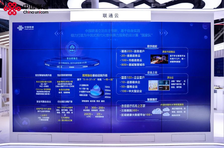 中国联通展区内,联通云助力千行百业“数字蝶变”的新图景正生动呈现,政务云、医疗云、央企云、智能视频云、信创云等具体案例,蕴含了数智未来的无限可能。