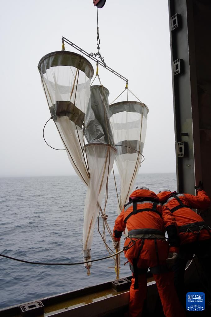 7月22日,中国第13次北冰洋科学考察队进行大洋作业演练,队员准备将浮游生物垂直拖网布放入海。