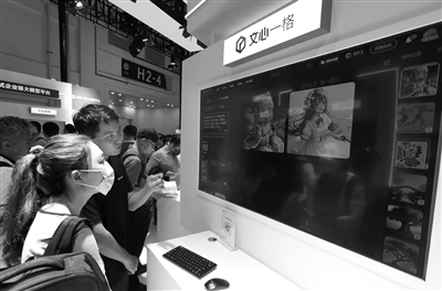 工作人员在2023世界人工智能大会展会现场向参观者介绍百度“文心一格”。 新华社记者 方喆 摄