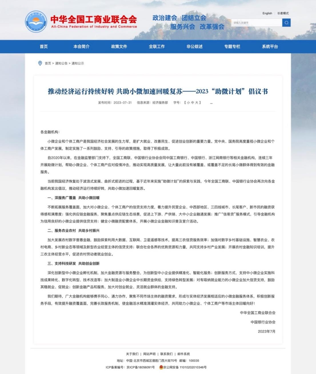 7月31日,全国工商联、中国银行业协会发布2023年“助微计划”倡议书,提出共同推动经济运行持续好转,共助小微加速回暖复苏。