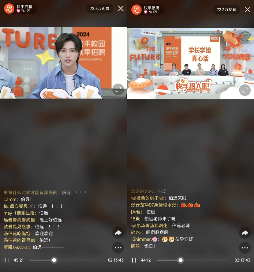 直播间里,伯远化身“求职者代表”,连连提问:从工作内容、工作价值到个人成长、职场氛围,从快手某一个功能的亮点,到某些用户视角的体验,伯远都“刨根问底”,让毕业生们对不同业务岗位、对快手这家公司有了更具象的了解。
