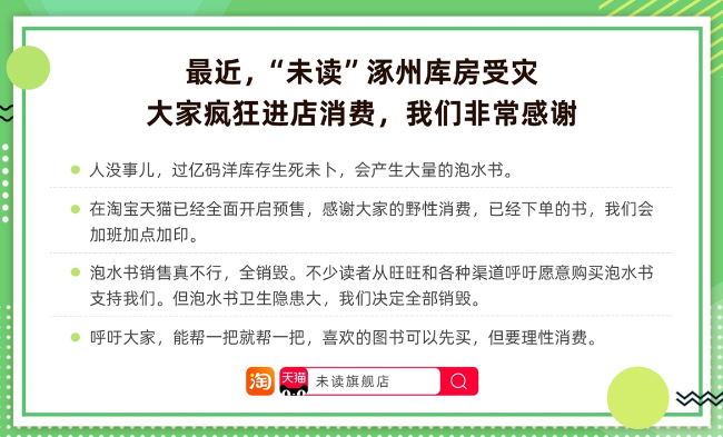 未读淘宝官方店挂出回应:将销毁全部泡水书,并呼吁大家能帮一把就帮一把。