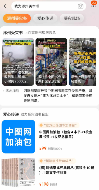淘宝于8月4日紧急上线 “我为涿州买本书”专场,会场内商品皆为受灾商家紧急盘出来可进行销售的图书和周边产品,包括中图网、未读旗舰店等本次受灾严重的出版方和图书公司。应网友呼吁,中图网还在专场内上线了“加油包”,供支持他们的爱书人下单。消费者在手机淘宝搜索“我为涿州买本书”即可直达会场。