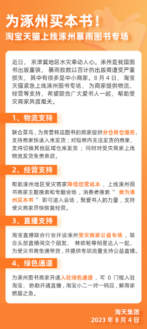 除此之外,淘宝还出台了一系列支持措施,为涿州地区受灾图书商家降低运营成本、上线直播专场、开店绿色通道等,帮助商家共渡难关。