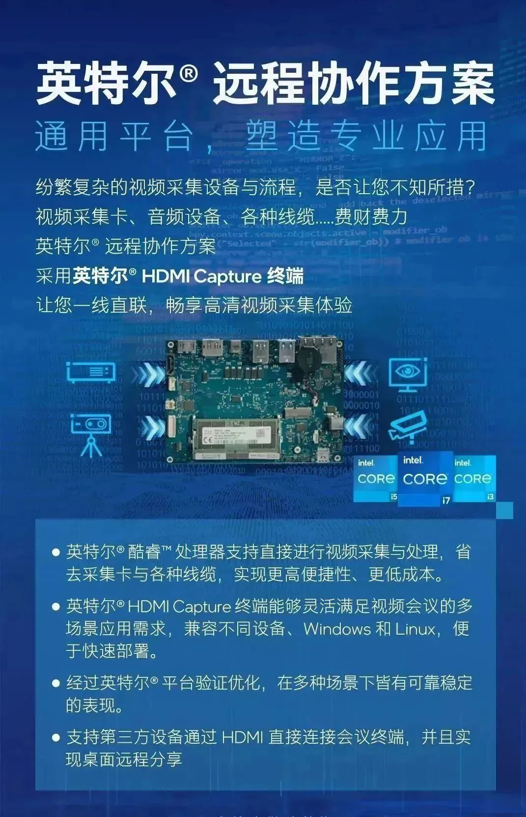 英特尔® 平台所具备的强劲处理能力,确保了不同终端及不同会议场景都可无缝切换流畅而统一的会议体验,主要分为以下几点:第一,英特尔® Media SDK 技术可实现超高速视频编解码,集成显卡还可支持硬件编解码,支持多方高清入会,从容解决视频会议室多画面要求;第二,英特尔® 酷睿™ 处理器集成的图像处理单元(IPU)可支持 MIPI 摄像头,并进行深度优化,提供远超传统 USB 摄像头的优秀画质;第三,HDMI-in 解决方案可实现视频采集和外界视频远程分享;第四,iGPU/dGPU 具备更强的编解码能力,可在服务器端助力解决效率问题。同时,在可用于快速部署AI应用和解决方案的OpenVINO™ 工具套件的加持下,能充分优化用户体验,不仅保证“看得清”,更要实现“看的全面”;第五,视频会终端可灵活扩展多种外设,全面支持大中小会议场景。