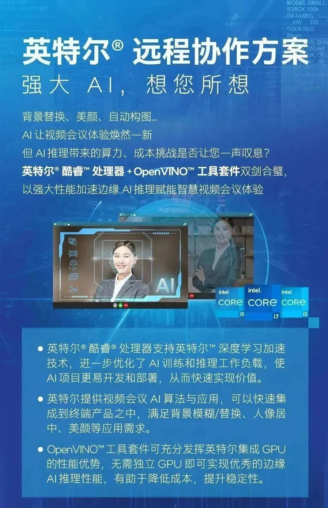 在全球化和数字化时代的推动下,远程协作正在成为未来工作环境中的重要趋势。为满足企业在数字化变革中的各种需求,英特尔不仅通过高性能硬件产品及设备打造可编程的、灵活的基础设施,还借助先进的软件及 AI 解决方案提供更强大的边缘算力和推理能力以实现自动化操作。