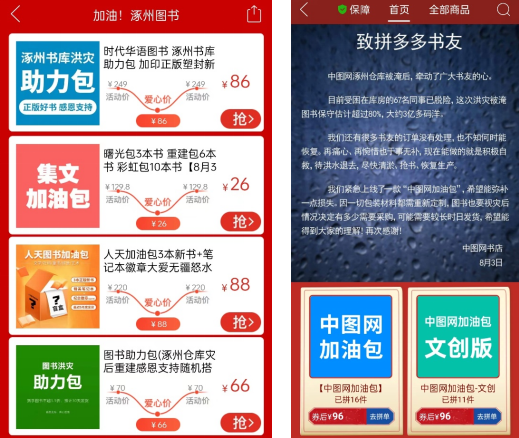 被洪水包围的第二天,拼多多针对部分受灾地区的发货时效作出调整,北京、河北多地店铺实施延迟发货政策,并由图书类目负责人对接中图网等受灾严重的出版机构,了解情况,协助开设店铺并提供帮助。