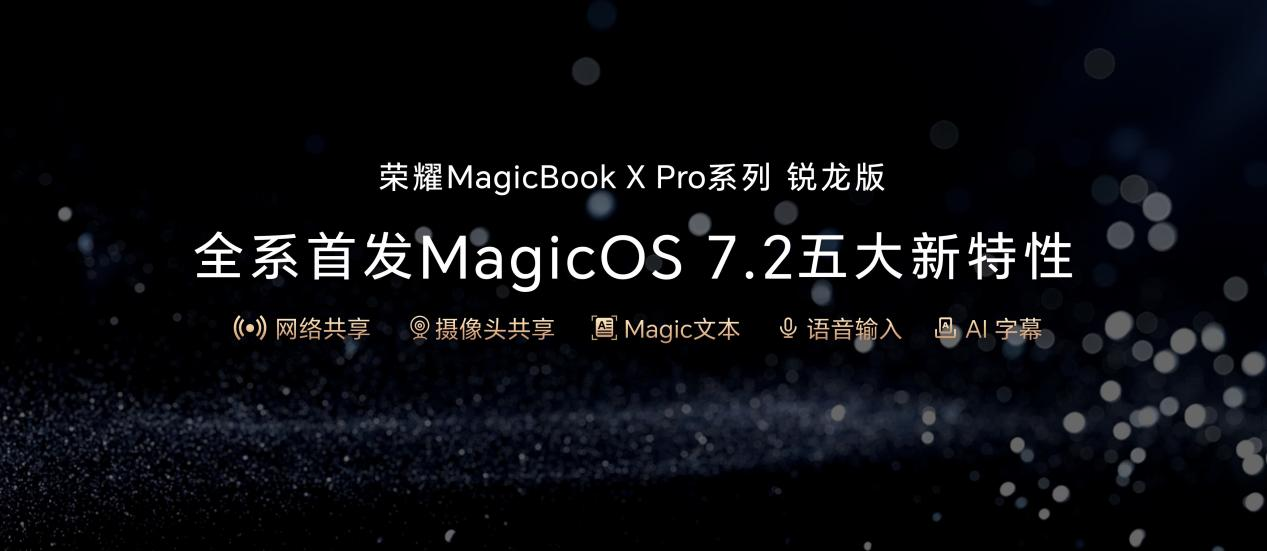 荣耀MagicBook X Pro系列锐龙版率先搭载MagicOS 7.2智慧互联新功能,在同一个荣耀账号下,打开蓝牙WLAN,便可以支持多设备之间自动成环,带来网络共享、摄像头共享功能,以及在荣耀Magic Live智慧引擎技术加持下带来全新的语音输入、Magic文本和AI字幕等功能。