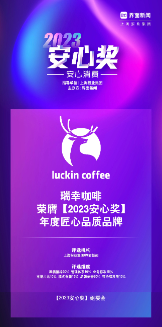 近日,在上海报业集团、界面新闻主办的“2023新消费盛典”上,瑞幸咖啡荣获“2023安心奖——年度匠心品质品牌”奖项。该奖项以“安心”作为落脚点,甄选极具口碑、创新、成长价值的优秀品牌,展现优秀品牌对中国消费领域发展所做的卓越贡献。