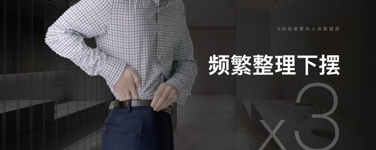 “衬衫老罗”在与自我竞争中,将“匠心”作为通关的不二法门。重视用户的真实感受,每个穿衬衫的男人,平均每天不定期地去3次洗手间塞衣服的下摆,让它不露出来,现代男性工作时大部分时间身体向前倾,基于用户最真实痛点,“衬衫老罗”在下摆和夹圈进行了优化设计,做抬手动作时衬衫也不会露出来。