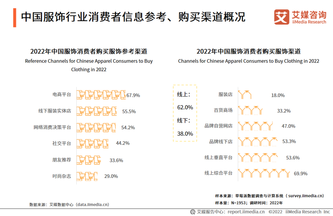 伴随企业数字化、智能化技术的应用,消费者的购买习惯也有所改变。根据艾媒咨询调研数据显示,2022年服饰消费者线上消费比例为62.0%,线下消费比例为38.0%,生活节奏加快、网上购物方便快捷是消费者选择线上购买服饰的原因,线上逐渐成为消费者购物主要渠道。