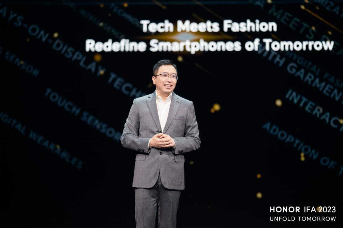 2023年IFA德国柏林消费电子展首日,荣耀CEO赵明在开场环节发表了题为《展开未来》的主题演讲。当天,荣耀向海外观众展示了旗下折叠旗舰Magic V2,并发布了最新的折叠屏概念机V Purse,引发现场观众驻足体验。