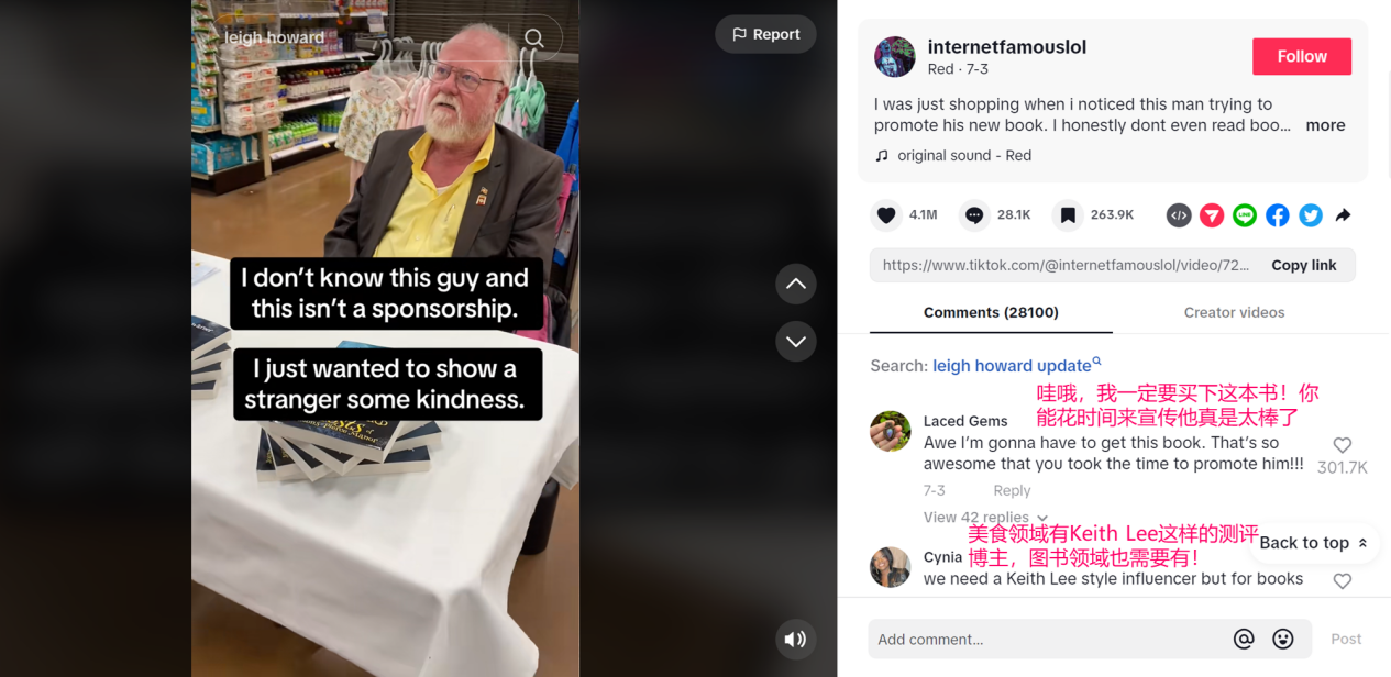 博主杰拉德在TikTok上发布了肖恩“超市卖书”的一幕