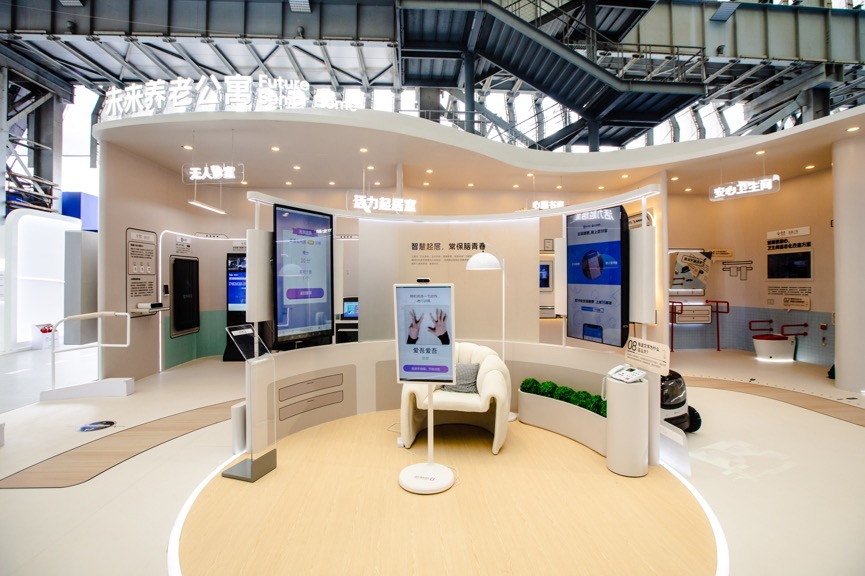 20年后的养老生活会是什么样?泰康、博腾、支付宝等共同在展区现场搭建了一个老年人养老公寓。在这个区域,随处可见房间中的暖心设计:多处有扶手,圆角房间,暖色灯光,防滑卫生间等。泰康还提供了老年人拟态服,观众穿着拟态服后可以切身体会高龄人群的日常活动,以便更好地理解老年人的处境与感受。
