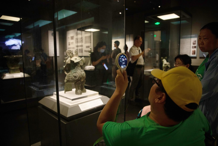 奇图无障碍成员在河南博物院用VR讲解器看“妇好鸮尊”
