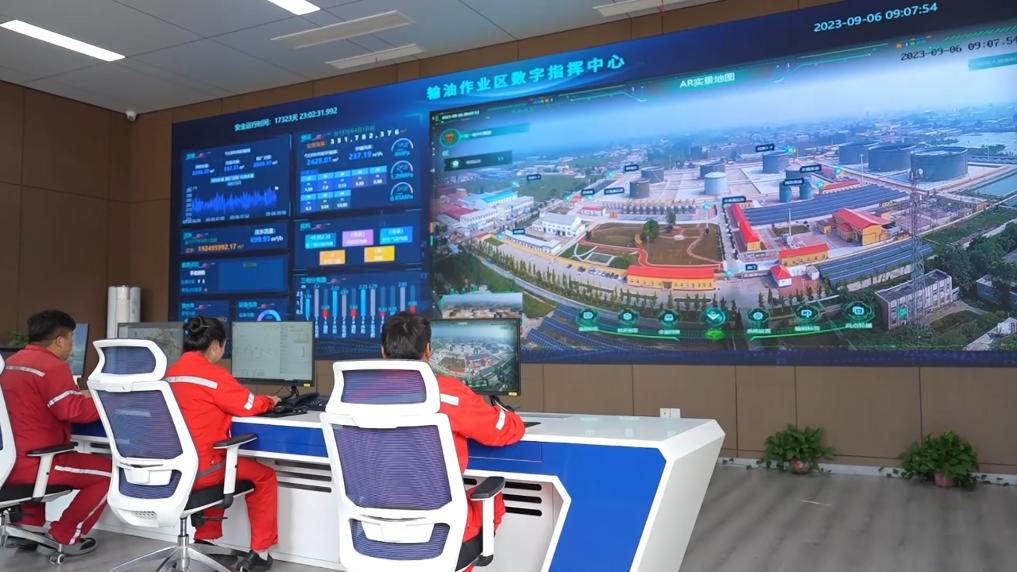 在河北省任丘市华北油田第一采油厂输油作业区区域指挥中心,大屏上显示着油水井、站场、管道等数据信息。利用“井站驾驶舱监控、云组态站控、AR实景监控、消防安保联动、管道运行监控”五大功能系统,使油水井、站场的隐患处理效率同比提高30%。