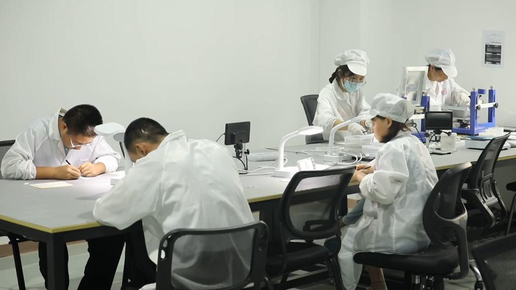 走进西安秦创原沣东先进制造产业园,砺芯慧感科技有限公司的工人们正在进行芯片分拣工作。