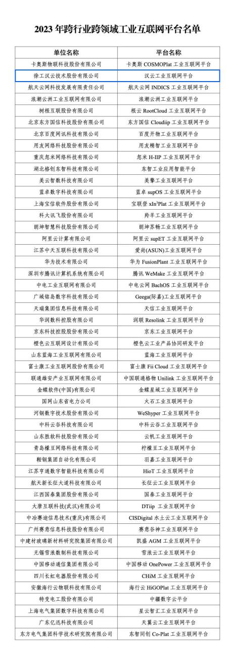 近日,工信部对外公布《2023年跨行业跨领域工业互联网平台名单》,此次“双跨”清单中,徐工汉云再次入选。自2019年工信部开展“双跨”平台评选以来,徐工汉云已实现连续五年入选。